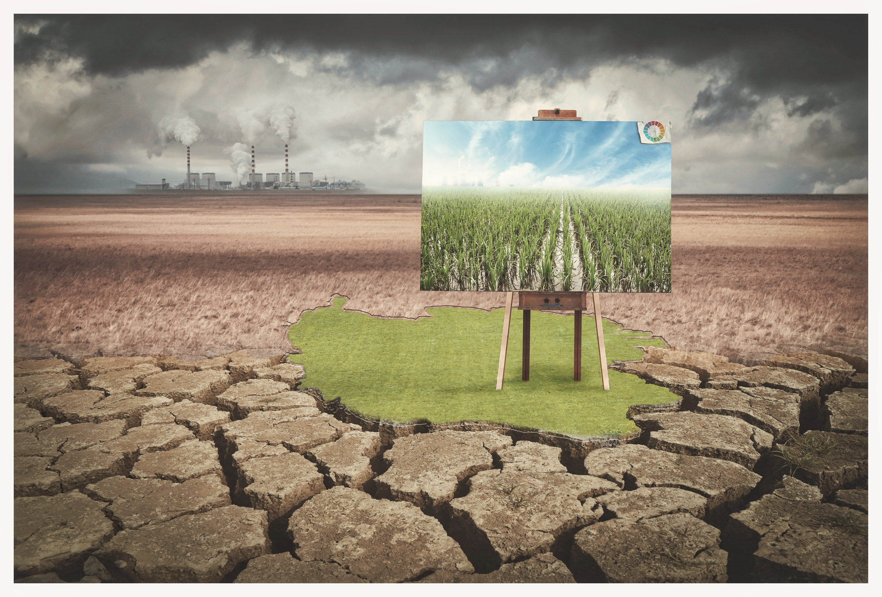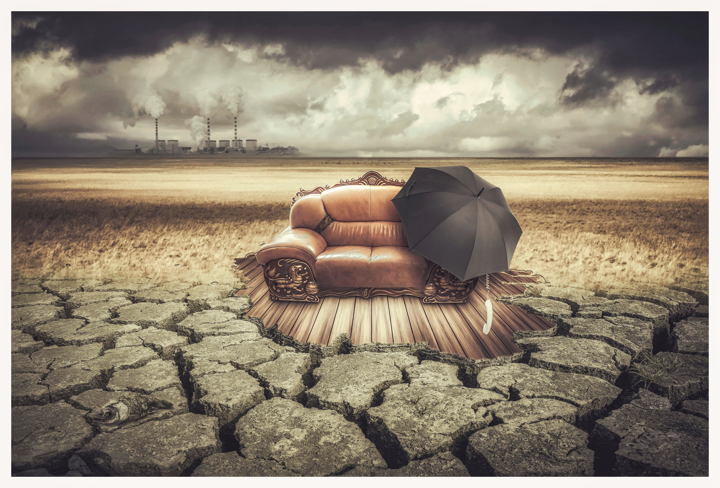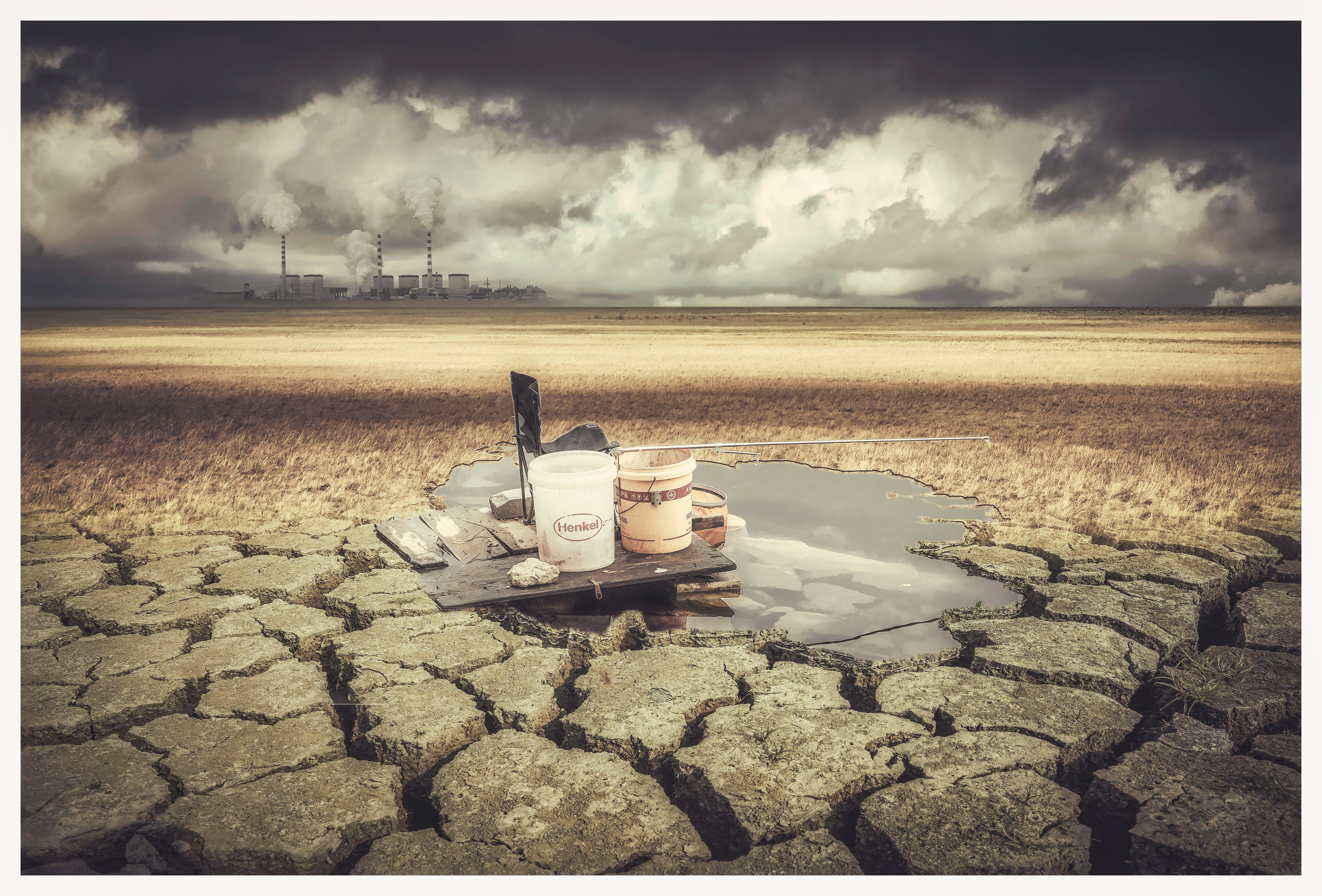 作品构建了 ** 工业污染(远方烟囱)与生态衰败(干裂土地、枯竭水源)** 的冲突场景,用沙发、雨伞、水桶、老牛、画架等日常 / 自然元素的 “错位摆放”,强化环境异变的荒诞与冲击: